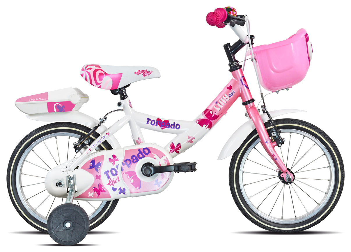 Lilly: Biciclettina per bambine con ruote da 14", nelle graziose combinazioni di bianco e rosa. Dotata di cestelli anteriore e posteriore, è perfetta per le giovani cicliste che stanno imparando a pedalare con l'aiuto delle rotelle laterali, per un'esperienza di guida sicura.